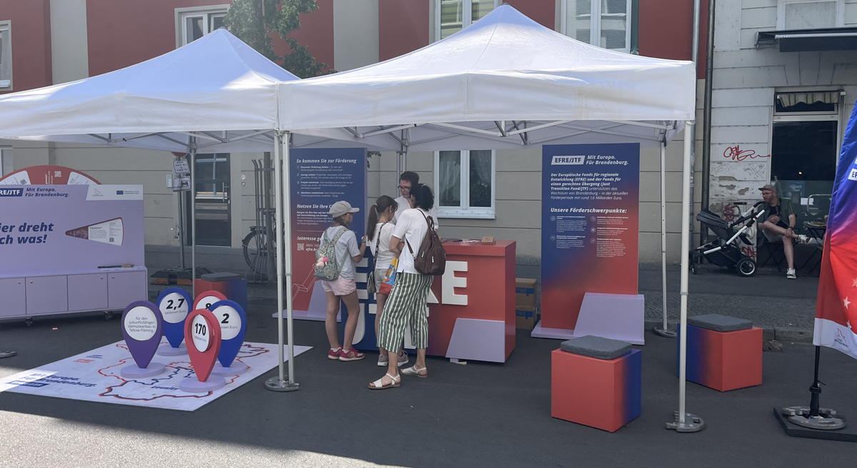 In diesem Jahr waren wir auf sechs Veranstaltungen, 15 Tourstopps und zwei Wanderausstellungsstationen vertreten. Ob beim Brandenburg-Tag in Perleberg, dem Lindenfest in Lübbenau oder dem Europafest in Potsdam: Die Veranstaltungen zeigten, wie europäische Fördermittel direkt vor Ort wirken. Bürgerinnen und Bürger, Förderinteressierte und Geförderte konnten sich informieren, Fragen stellen und ihre Perspektiven teilen.